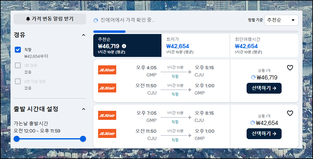 검색 결과 페이지에서는 다양한 항공권을 확인할 수 있어요. 최저가순으로 정렬하면 가장 저렴한 옵션을 쉽게 찾을 수 있습니다. 제주도 노선은 직항으로 선택하는 것이 좋고, 이른 아침이나 늦은 저녁 시간대가 보통 더 저렴해요.