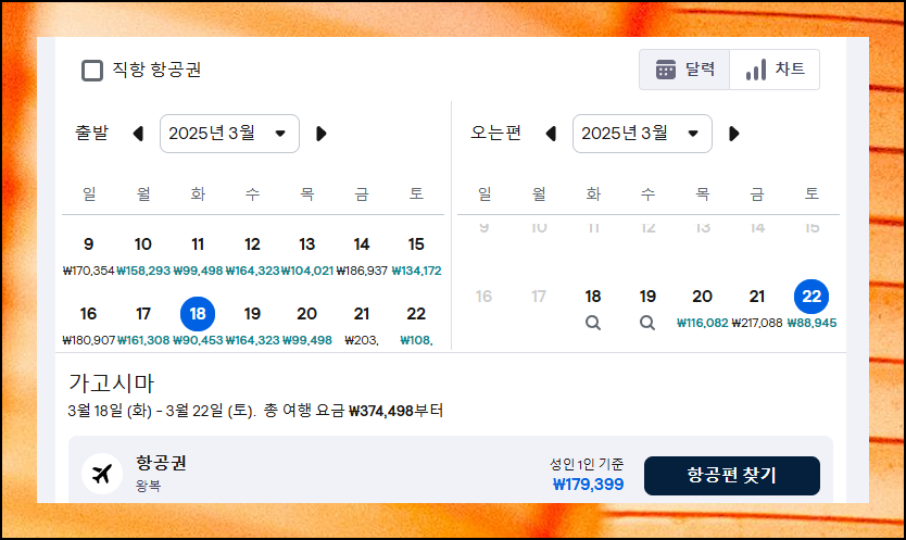 달력에서 색다른 모험이 시작됩니다. 가고시마 비행기표를 예로 들어볼까요? 최저가 날짜를 찾아 클릭하면 18만원대의 특가도 만날 수 있어요. 일본 여행 일정을 탄력적으로 조정하면 더 큰 혜택을 누릴 수 있습니다. 본인의 여행 일정을 참고하여 최저가를 선택해 보세요.