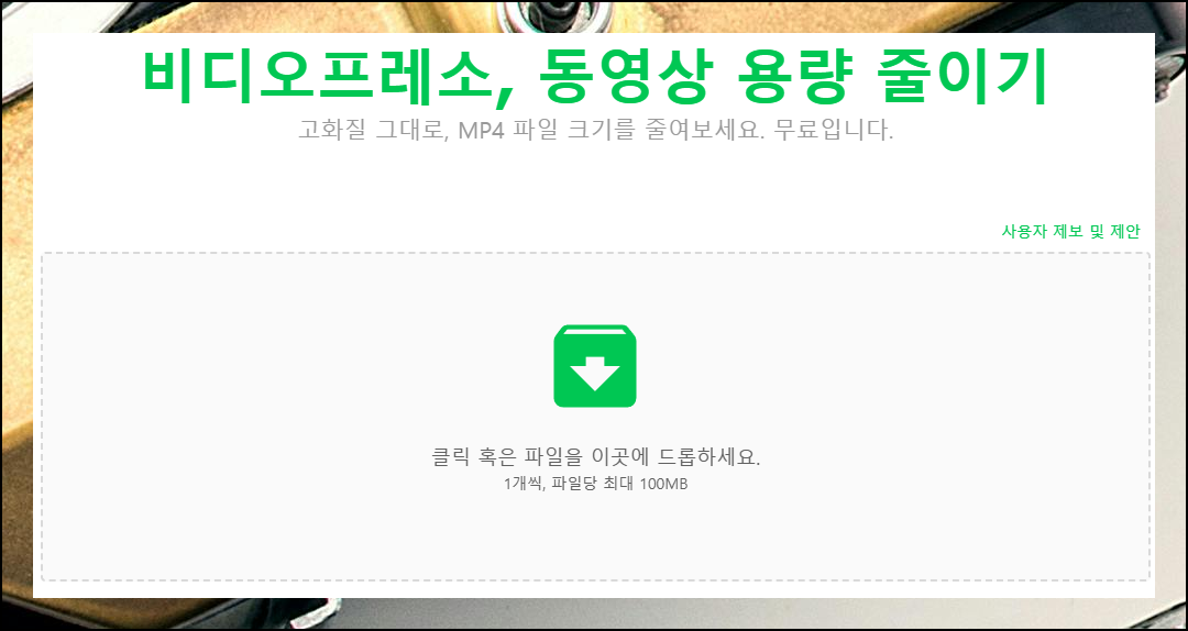 비디오 프레소를 소개합니다. 100메가바이트까지 가능한 이 툴은 간단한 드래그 앤 드롭으로 영상을 줄일 수 있어요. 용량줄이는법의 새로운 기준을 제시하는 서비스입니다.