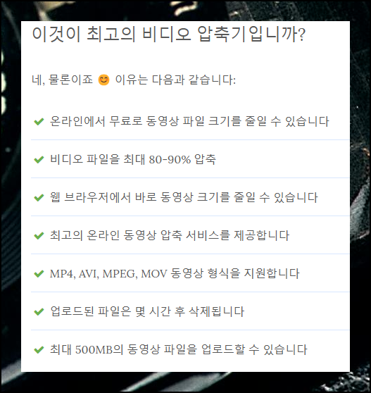 간단하게 인터넷을 통해 누구나 무료로 비디오 파일의 용량을 줄일 수 있습니다. 사용법이 간단해요. 화질은 그대로 유지하면서 파일 크기를 최대 92퍼센트까지 줄일 수 있다고 합니다. 그럼 순서대로 따라해 보세요.