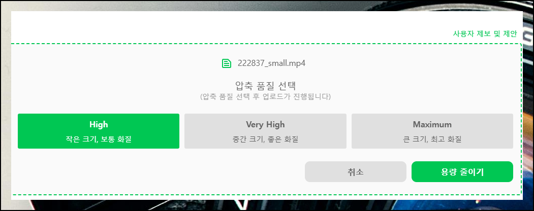 비디오 프레소는 세 가지 압축 옵션을 제시합니다. 동영상 저장 공간이 부족할 땐 high를, 선명도를 중시한다면 maximum을 선택하세요. 환경에 맞는 최적의 설정을 고를 수 있습니다. 용량을 최적화하면서도 원하는 품질을 유지할 수 있어요.