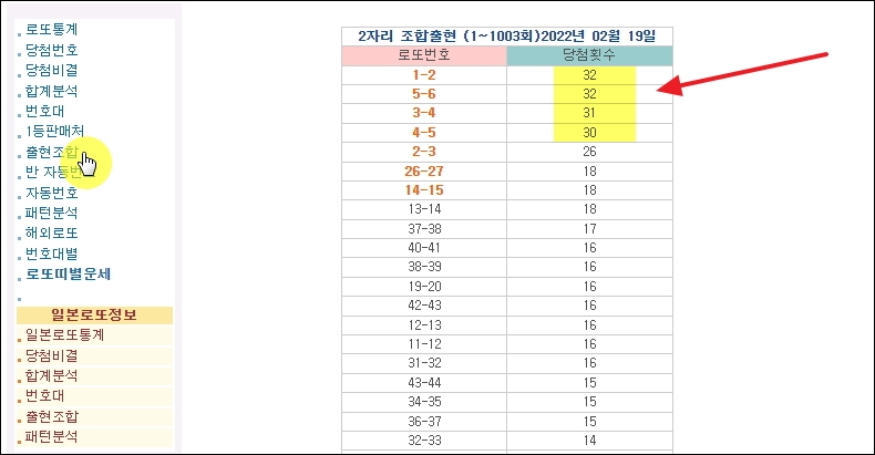 ▼메뉴에서 [출현조합]을 선택해 보았습니다. 연속된 숫자가 나온 경우를 가지고 통계 자료를 만든 것입니다. 1번과 2번 그리고 5번과 6번이 연달아 나온 횟수가 32회로 가장 많습니다. 그 다음으로 3번과 4번이 연달아 나온 경우는 31회로 두번째 많은 것을 확인할 수 있습니다.