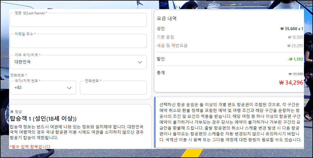 예약 사이트에 접속했습니다. 우선적으로 항공운임, 유류할증료, 제세공과금, 발권수수료을 자세히 살펴보세요. 처음 확인했던 값과 최종 결제 금액은 차이가 있을 수 있으니 이 단계에서 모든 경비를 확인하는 것이 중요해요. 저가항공권 예매 과정에서 놓치기 쉬운 부분이니 주의하세요.