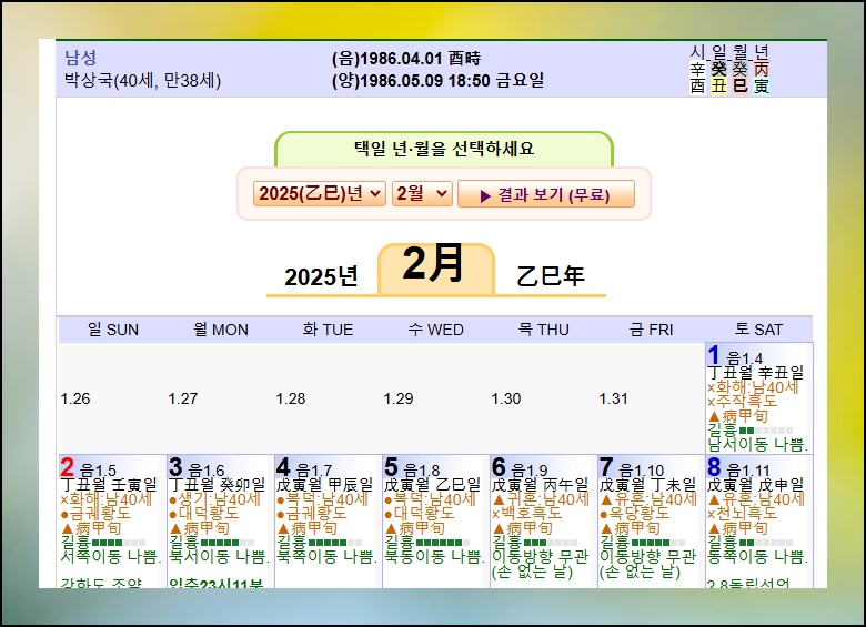 일일 점괘가 궁금하다면 택일 만세력 기능을 활용해보세요. 25년 2월을 살펴볼게요. 여기 나와 있듯이 날짜별 길흉과 손 없는 날을 무료로 쉽게 확인할 수 있답니다. 중요한 일정이 있다면 미리 운세 서비스를 통해 좋은 날을 선택하세요.