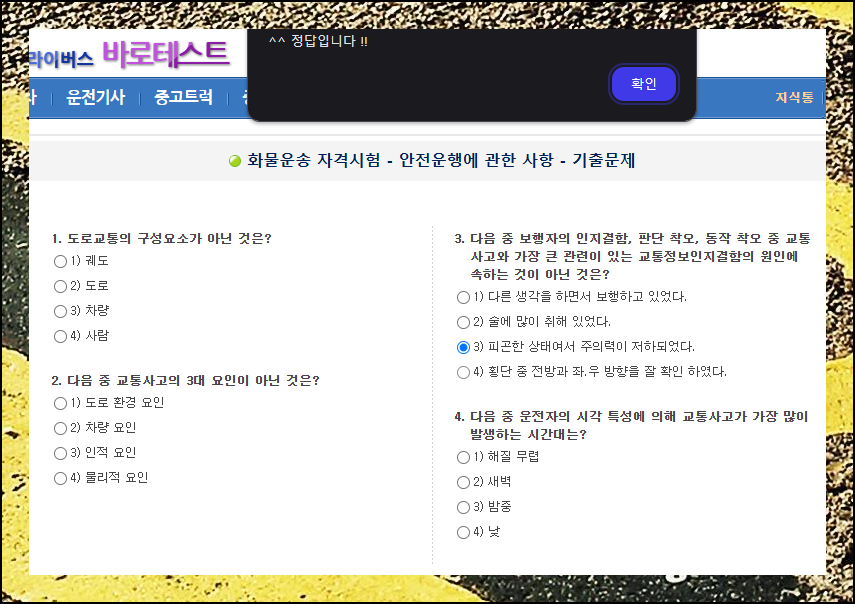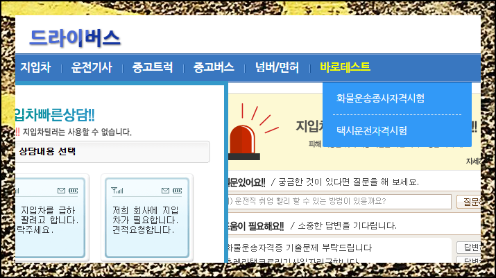 화면 우측에서 드라이버스 바로테스트 항목을 선택하면 화물운송종사 자격증 평가 화면으로 안내됩니다. 필요한 자료를 쉽고 빠르게 찾을 수 있도록 구성되어 있어요.