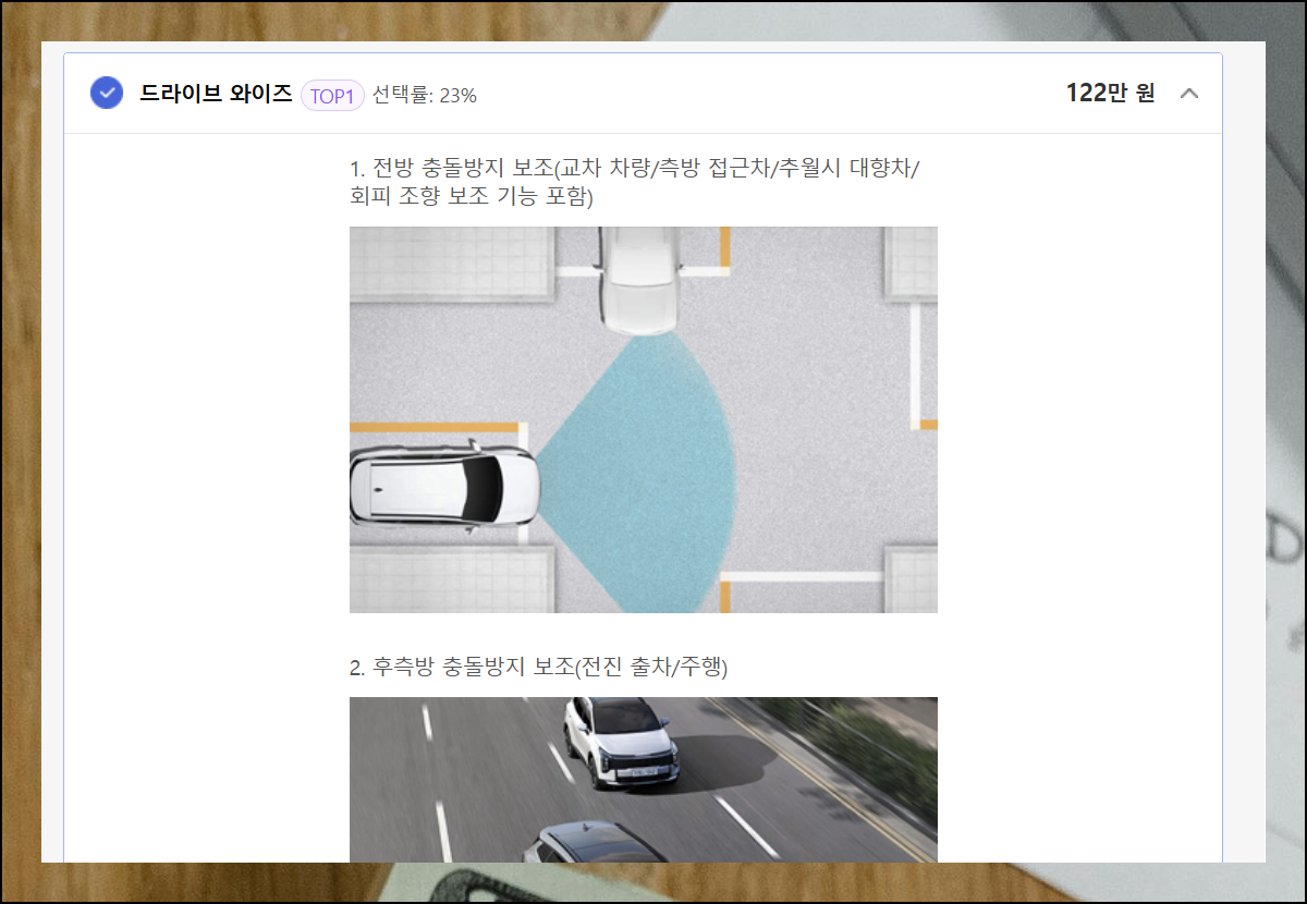 두 번째 단계는 추가 기능과 색상 선택입니다. 인기 옵션을 손쉽게 확인할 수 있어요. 명칭만으로는 기능 파악이 어려울 수 있으니, 가격표 옆 화살표를 클릭하세요. 다나와에서 제공하는 설명을 통해 각 특징과 혜택을 명확히 이해할 수 있습니다.