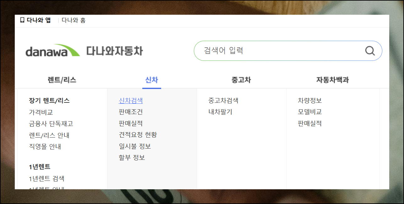 다나와 홈페이지에 접속한 후 상단 메뉴에서 '신차'를 클릭하세요. 그다음 '신차 검색' 버튼을 선택하면 됩니다. 웹사이트 구성이 간단해서 처음 방문하더라도 쉽게 이용할 수 있습니다.