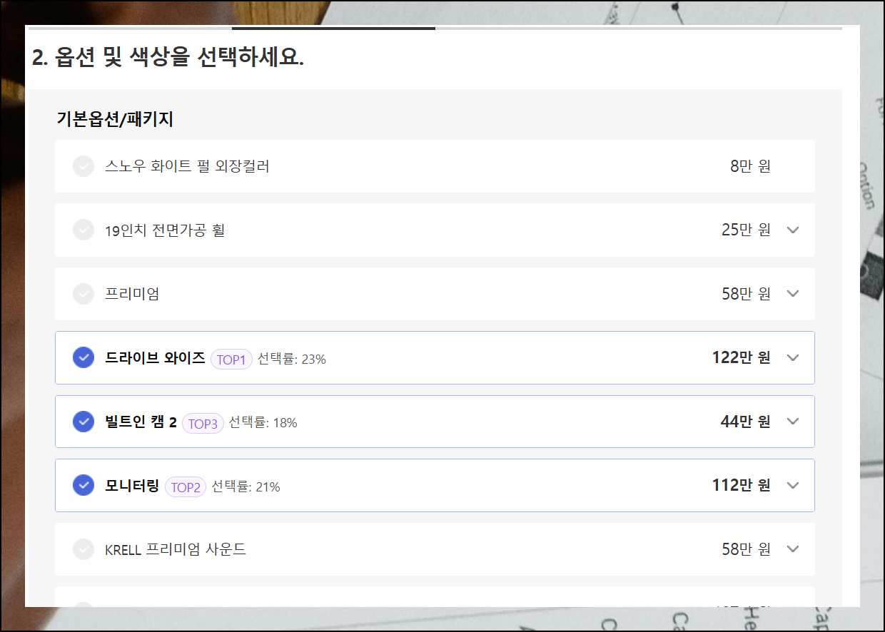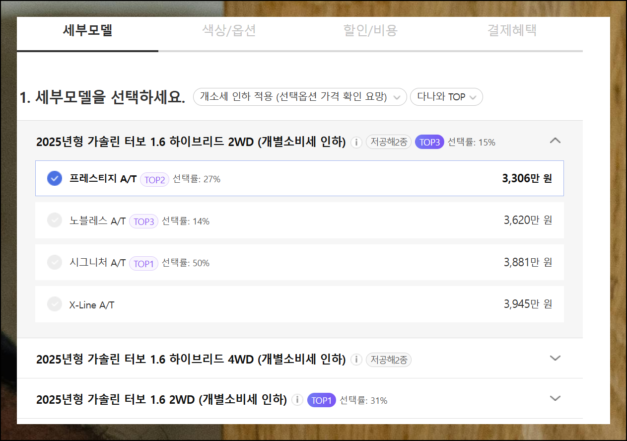 견적 과정은 총 네 단계로, 익숙해지면 1분 이내에 완료할 수 있습니다. 첫 번째로 세부 스펙을 선택해요. 선호도 기준으로 인기 차종이 상단에 표시됩니다. 선택 시 필요한 옵션, 내장 디자인, 엔진 성능 등을 비교해보세요.