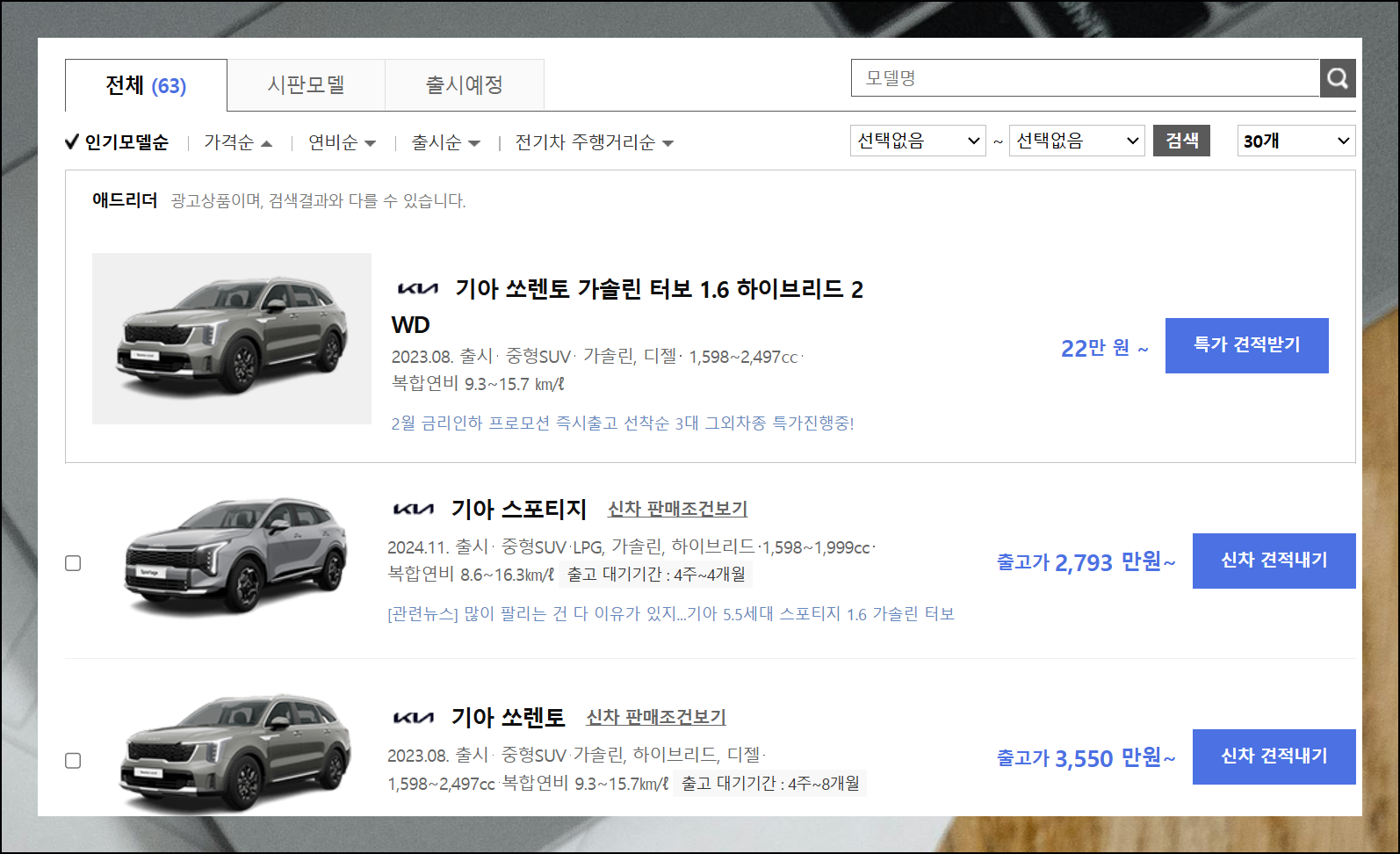 조건에 맞는 차량이 여러 종류 나타납니다. 인기 있는 몇 가지 제품을 살펴보세요. 각 차량 정보와 함께 표시된 금액은 기본 가격입니다. 실제 구매 시에는 추가되는 옵션이나 선택하는 할인조건에 따라 전체 비용이 달라질 수 있어요. 정확한 최종 금액을 알고 싶다면 '신차 견적 내기' 버튼을 누르세요.