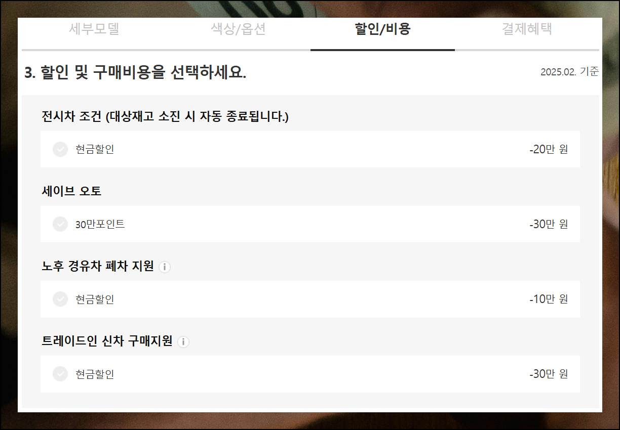 세 번째는 할인 및 구매 관련 항목입니다. 자동차 제조사들은 매월 다양한 프로모션으로 특별 혜택을 제공해요. 이런 기회를 활용하면 상당한 비용을 절약할 수 있습니다. 시즌별 프로모션도 놓치지 마세요.