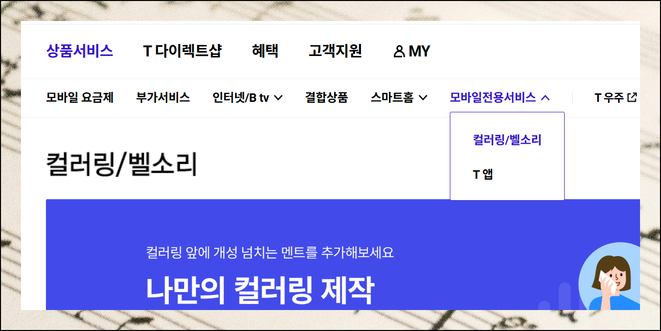 티월드 사이트에 접속한 후 상단 메뉴에서 '상품서비스'를 클릭하세요. 화면에 표시되는 모바일 전용 서비스 목록 중에서 "컬러링/벨소리" 항목을 찾아 선택하면 됩니다.