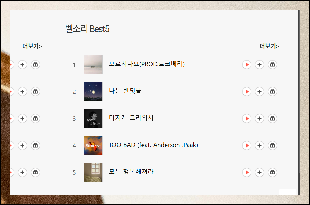 새 페이지에서는 현재 가장 많이 찾는 전화 알림음 Top 5를 확인할 수 있어요. '모르시나요', '나는 반딧불' 등 최신 인기곡들이 상위권에 올라와 있습니다. 더 많은 추천 벨소리를 만나보고 싶다면 페이지 우측 상단의 "더보기" 버튼을 클릭해 전체 목록을 확인해보세요.