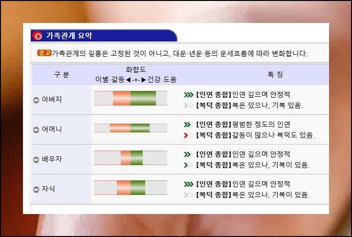 가족 관계(부모, 배우자, 자녀)도 사주에 중요한 영향을 미칩니다. 인연, 갈등, 복덕에 관한 사항을 확인할 수 있어요. 또한 재물, 사업, 직장, 명예, 인격, 학문과 같은 사회생활 관련 정보도 조회됩니다. 특이사항이 표시되는 경우 중요한 메시지가 포함되어 있을 수 있으니 사주팔자 해석 시 꼭 살펴보세요.