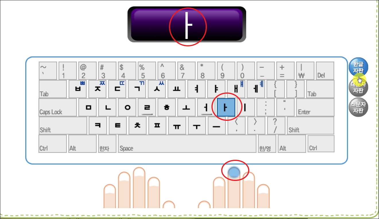 ▼타자연습을 처음 시작할 때에는 자판연습을 통해 글쇠를 익혀야 합니다. 다음과 같이 각 글쇠에 맞는 손가락을 그림으로 알려주기 때문에 정확한 타이핑을 할 수 있도록 도와줍니다. 자판을 익힐 때에는 한글은 물론이고, 영문 자판도 익힐 수 있습니다.