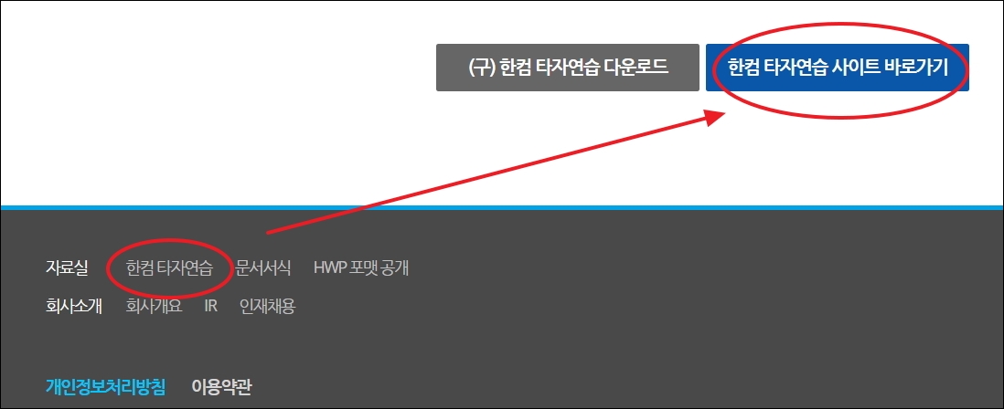 ▼한컴 홈페이지에 접속하면 화면을 쭉 아래로 내려봅니다. 그럼 [한컴타자연습] 메뉴를 찾을 수 있습니다. 해당 메뉴를 누르면 무료 타자연습 바로가기 버튼을 만나볼 수 있습니다. 오프라인 버전인 타자연습 프로그램을 다운 받아 설치하는 것도 가능합니다.