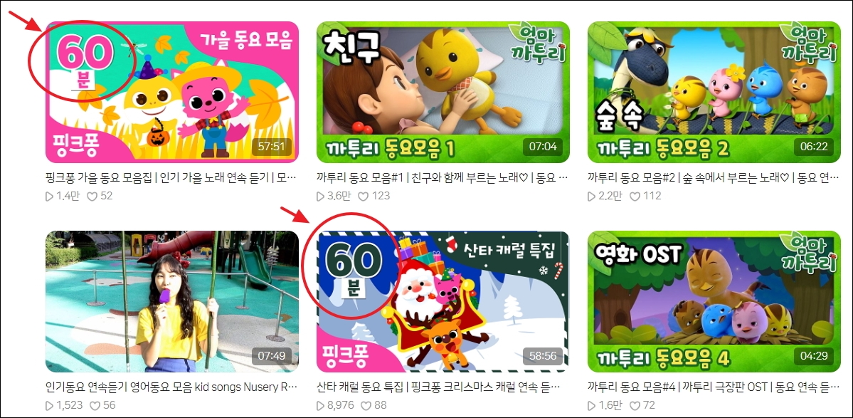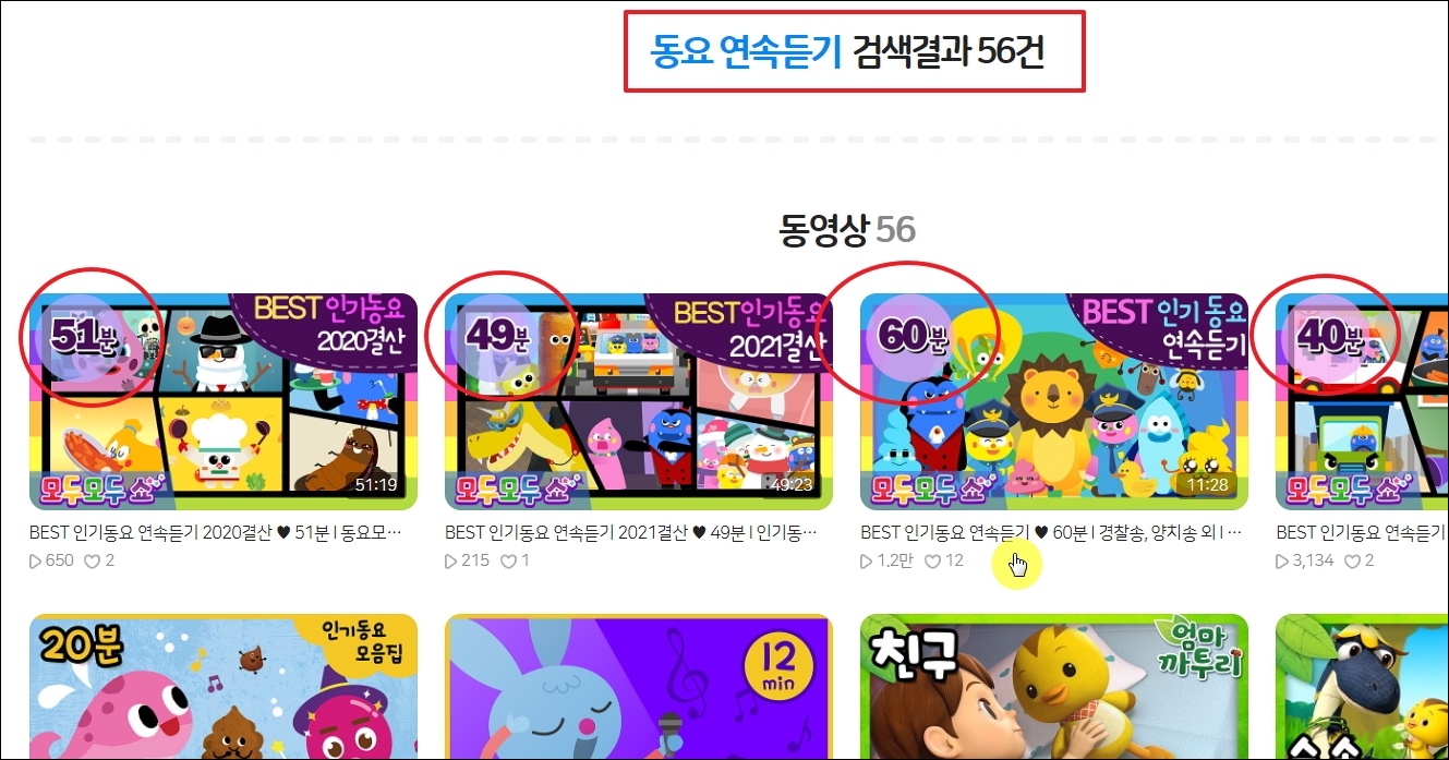 ▼검색 결과를 보면 알 수 있듯이 수십 개의 아기동요 무료 연속듣기 컨텐츠를 찾을 수 있습니다. 유아와 어린이 모두를 위한 것이기 때문에 아이가 좀 컸을 때에도 들려줄 수 있습니다. 검색된 컨텐츠를 살펴보면 40분, 49분, 51분, 60분 동안 연속듣기 가능한 동요 모음집이 보입니다. 감상하고 싶을 것을 선택해 봅니다.