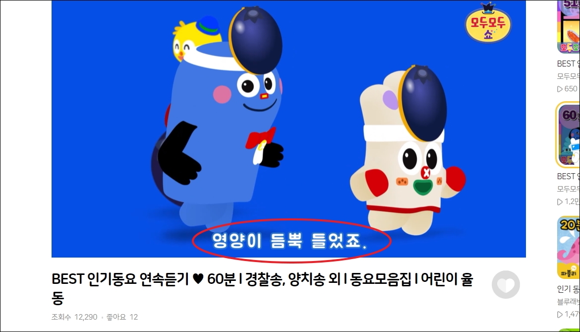 ▼동요 모음집을 재생 시켜 보면 귀여운 케릭터가 움직이는 영상과 가사로 된 자막을 확인할 수 있습니다.