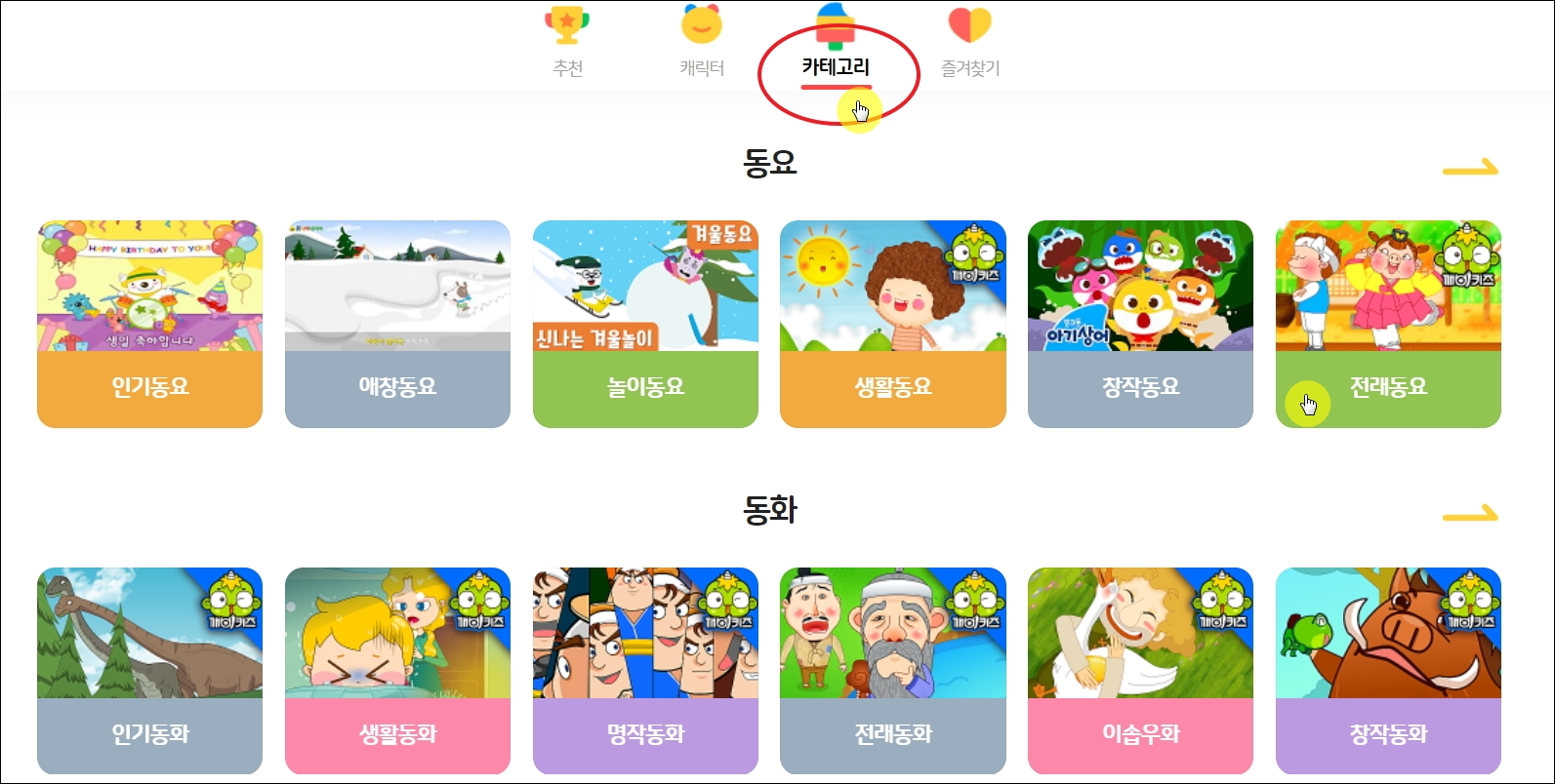 ▼쥬니버에서는 굉장히 많은 어린이 컨텐츠를 만나볼 수 있습니다. 아이들이 좋아할만한 인기 동요와 인기 동화를 이용하면 좋습니다. 메뉴에서 [카테고리]를 클릭하면 여러 종류의 동요와 동화 카테고리를 선택할 수 있습니다.
