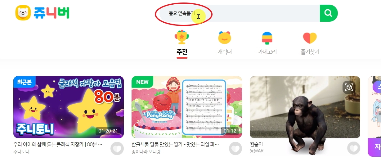 ▼사이트에 접속하면 메인화면을 통해 여러 유아 및 어린이를 위한 무료 컨텐츠를 만나볼 수 있습니다. 아기를 재울 때 클래식 자장가 모음집 같은 것도 들려주면 정말 좋습니다. 마음이 안정되고, 선율도 아름다워서 연속듣기 하기에 전혀 무리가 없습니다. 아기동요 모음집을 찾기 위해 검색창에 [동요 연속듣기]를 입력 후 검색 버튼을 클릭합니다.