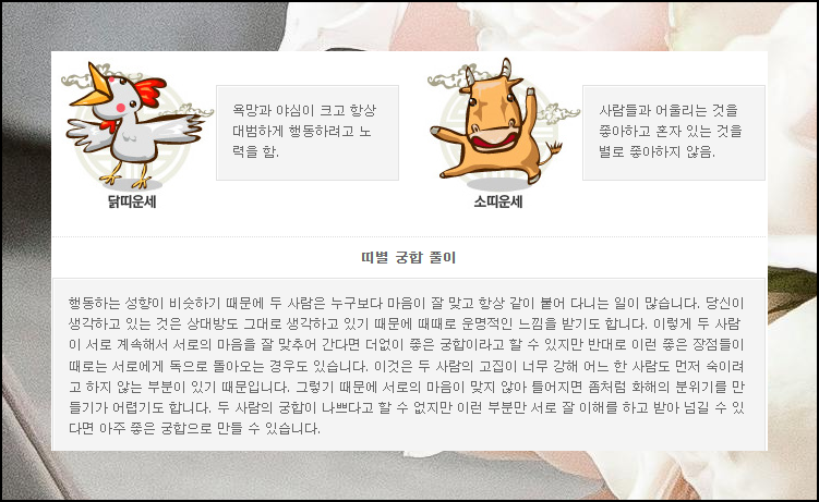 선택한 띠에 따라 상세한 풀이 내용을 볼 수 있는데요. 둘 사이의 관계에 대하여 장단점을 파악할 수 있고, 더 좋은 관계로 발전시킬 수 있는 실질적인 조언도 받을 수 있어요.