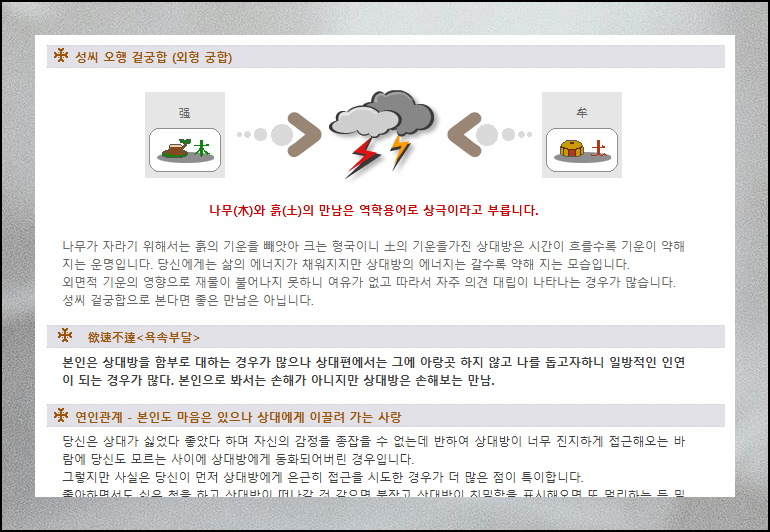 선택한 띠에 따라 상세한 풀이 내용을 볼 수 있는데요. 둘 사이의 관계에 대하여 장단점을 파악할 수 있고, 더 좋은 관계로 발전시킬 수 있는 실질적인 조언도 받을 수 있어요.