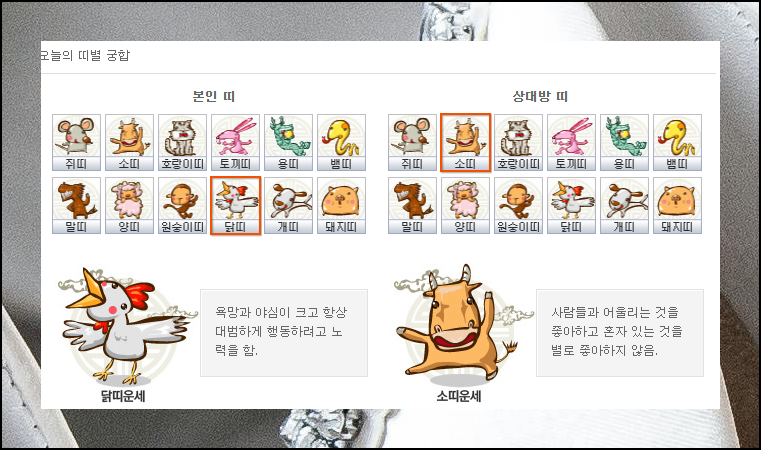 오늘의 띠별 궁합을 이용해 보세요. 재미있고 유용한 정보를 제공해요. 상대방의 나이를 알고 있다면 쉽게 띠를 파악할 수 있는데요. 이를 참고하여 본인과 상대방의 띠를 선택하면 각 띠의 성향과 함께 서로 얼마나 잘 맞는지 확인할 수 있습니다.