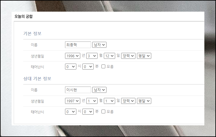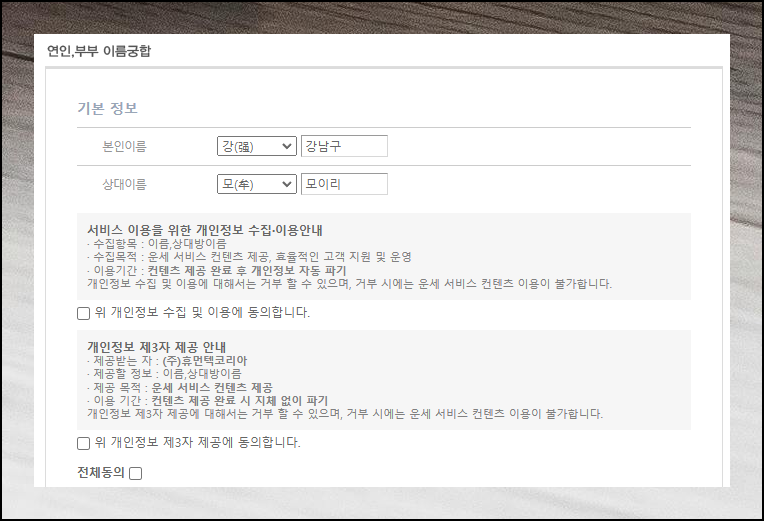 이번에는 이름만 입력하면 되어 가장 간편하게 볼 수 있는 서비스에요. 다만 정확한 결과를 위해 상대방의 성씨를 한자로 정확히 알고 있어야 합니다. 연인뿐만 아니라 다양한 관계의 무료 궁합 풀이를 볼 수 있어요.