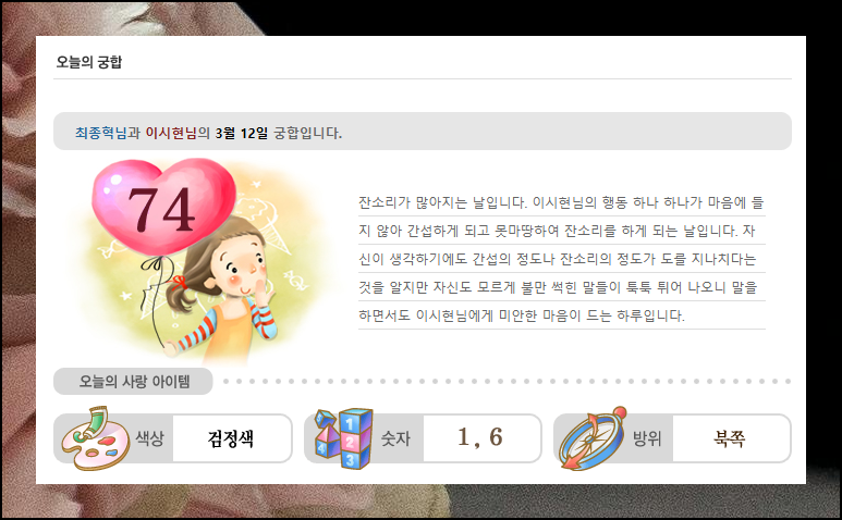 | 궁합보기 무료 사이트 (풍부한 해석) (1) | 2025.07.11 |