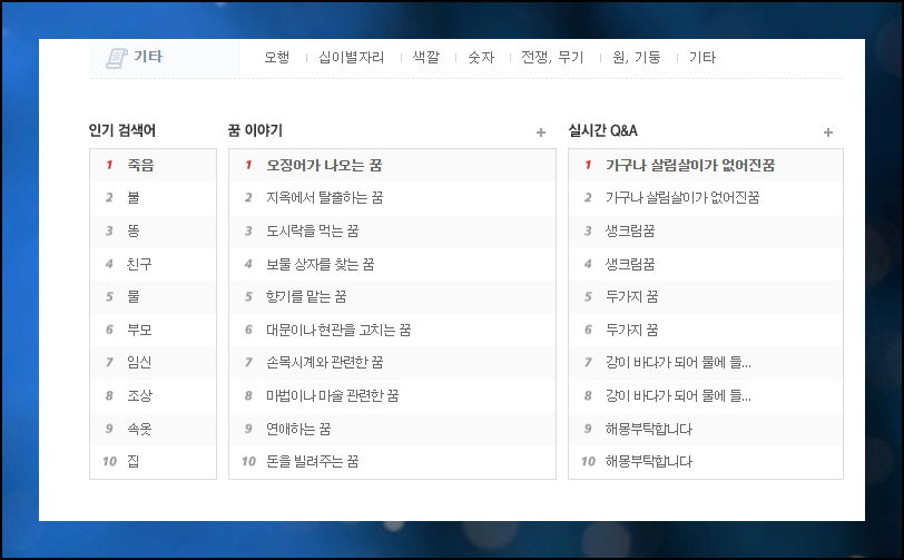 키워드 검색이나 카테고리 선택 두 가지 방식으로 원하는 해몽을 빠르게 찾아볼 수 있으며, 개인 운세와 관련된 추가 정보도 함께 확인하실 수 있어요.