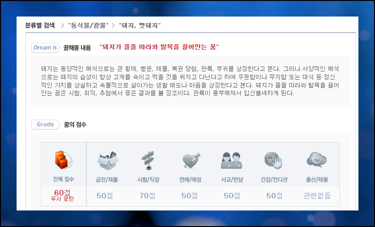 행운의 상징인 돼지가 등장하면 좋은 의미를 가진다고 해요. 예를 들어, 돼지가 발목을 끌어안는 경우에는 점수가 60점으로 살짝 행운이 들어오는 수준이지만, 시험운과 직장운은 70점으로 높게 나타났습니다. 이는 승진이나 시험 합격 가능성이 있다는 신호입니다. 무료풀이를 통해 이런 내용을 파악하고 앞으로의 기회에 대비해보세요.