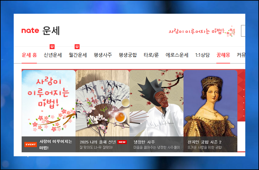 네이트 운세 코너에서는 별도의 회원가입이나 결제 없이 무료 사주풀이를 볼 수 있어요. 꿈해몽 메뉴만 선택하면 바로 서비스 활용이 가능합니다. 타 사이트들과 달리 번거로운 과정 없이 무료풀이 결과를 즉시 확인할 수 있어 시간이 절약됩니다. 꿈해몽 서비스로 오늘의 운세도 함께 체크해보세요.