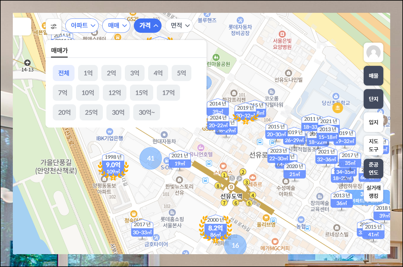 본인의 예산에 맞는 주거지를 탐색하기 위해 가격 조건을 설정해보세요. 매매가, 전세가, 보증금, 월세 금액 범위를 지정하면 예산에 딱 맞는 아파트 시세만 필터링하여 볼 수 있답니다. 현실적인 조건으로 꿈의 집을 찾아보세요.