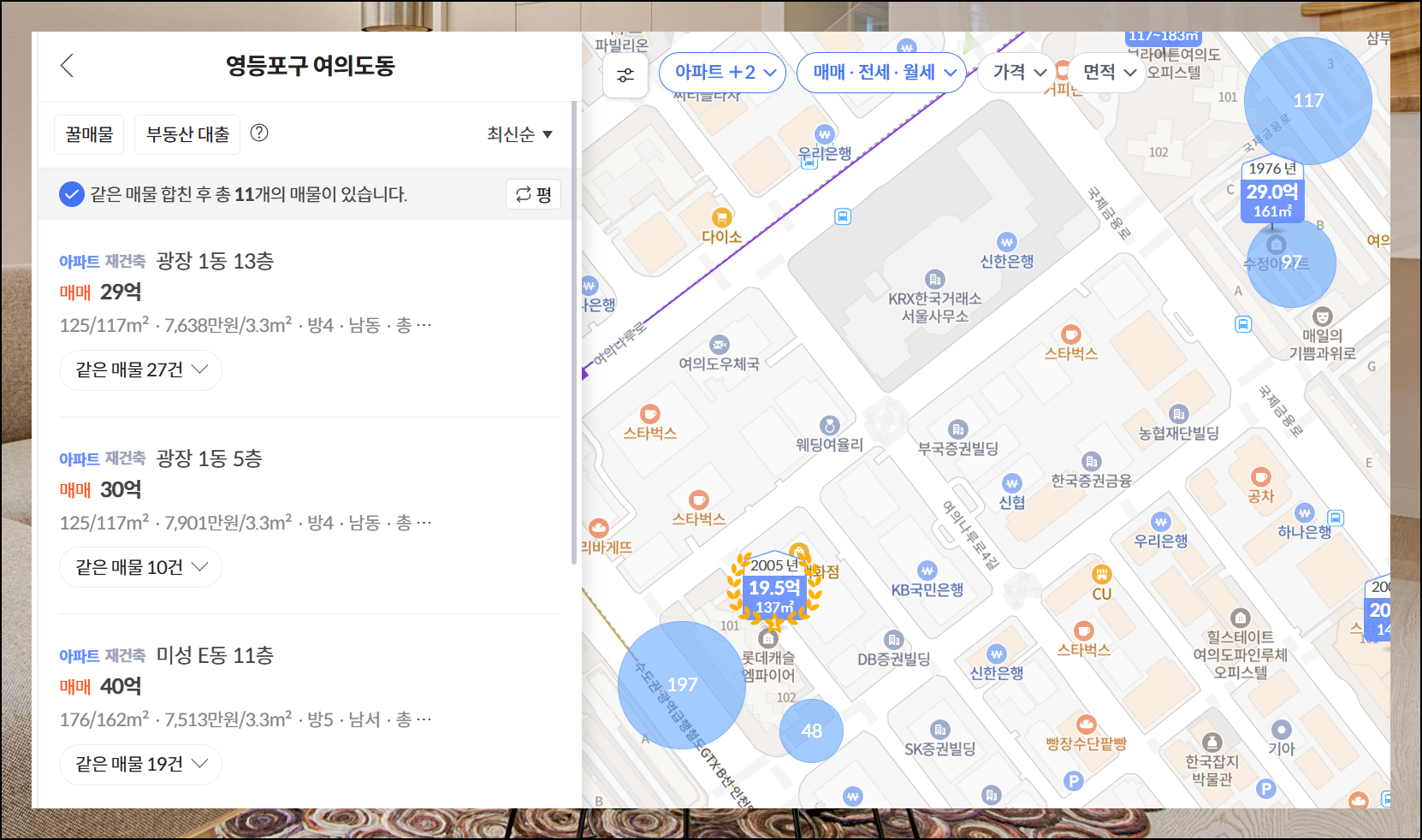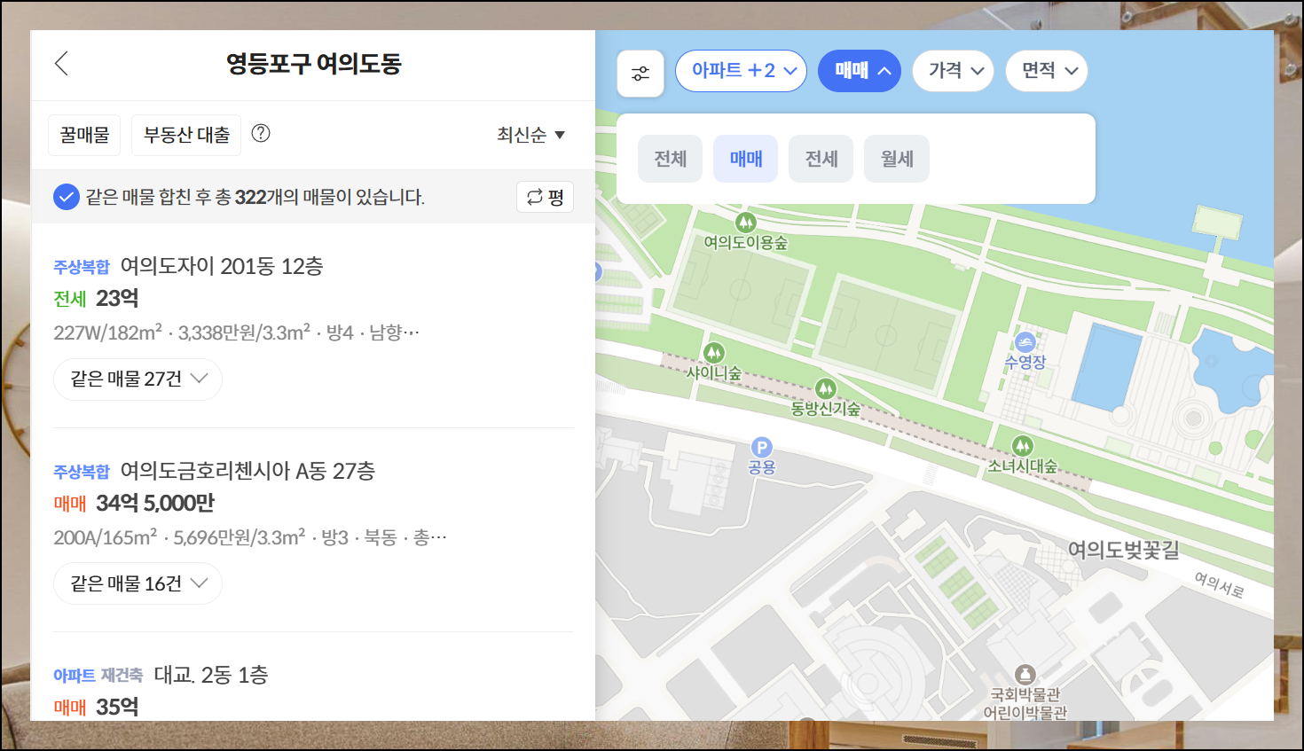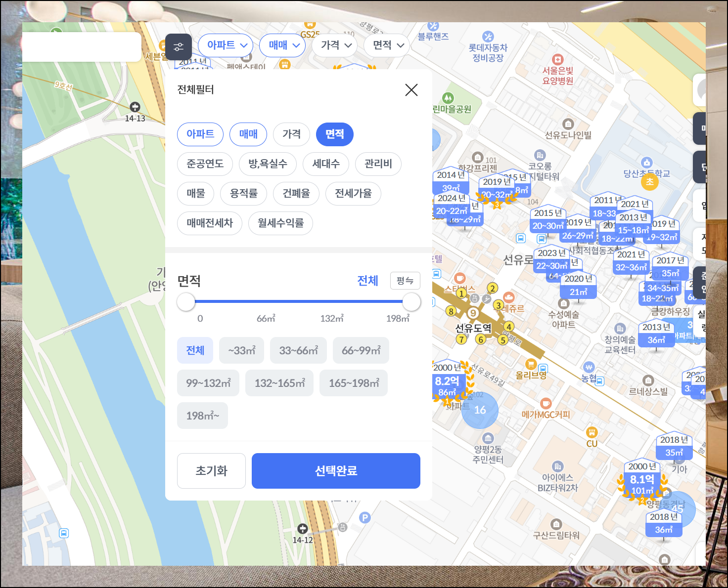 더 세밀한 기준으로 찾고 싶다면 면적, 준공년도, 세대수부터 평균 관리비, 향, 주차가능 여부까지 다양한 옵션을 활용해보세요. 전국 어디서든 시세 조회가 가능하니 원하는 기준을 상세하게 설정하여 완벽한 매물을 찾아보세요.