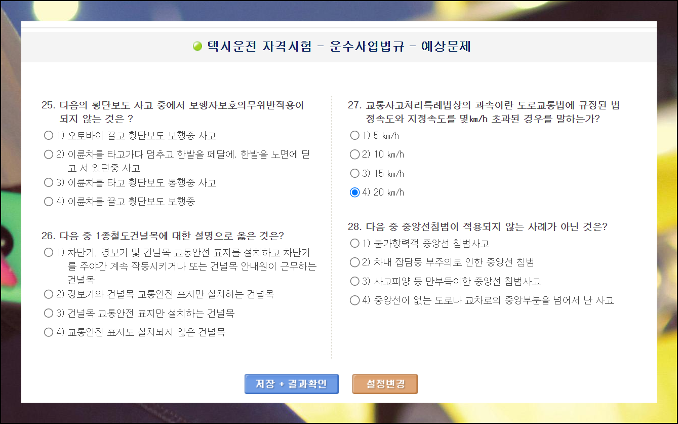 택시운전 시험의 예상 및 실전 기출문제를 모두 살펴보는 것이 실력 향상에 도움이 됩니다. 자격시험 합격을 위해서는 반복 연습이 필수예요. 여기에 해당하는 과목인 운수사업법규, 안전운행, 운송서비스, 지리 관련 내용을 모두 확인할 수 있으니 [문제풀기] 버튼을 눌러 도전해보세요.