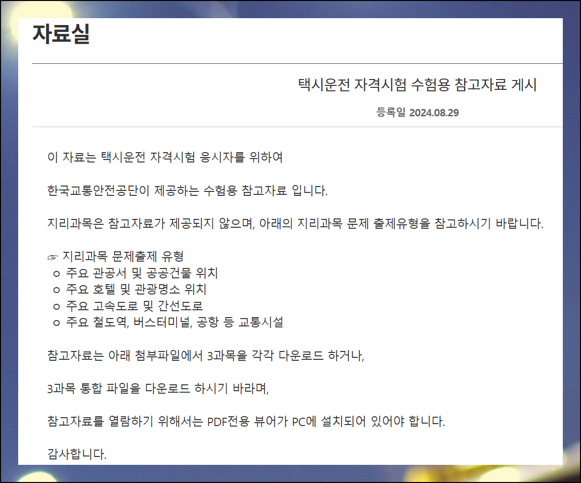 기출문제 풀이 전에 "수험용 참고자료"로 기본 개념을 익히세요. 택시운전 자격시험 준비의 첫 단계죠. 파일은 용량이 커서 압축되어 있으니 반디집이나 알집으로 압축을 해제하면 됩니다. 지리 과목은 별도 참고서가 없으니 다른 방법으로 대비해야 해요.