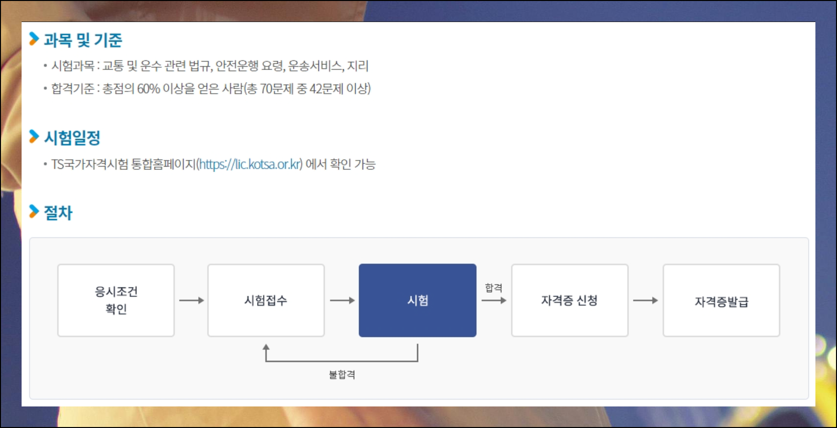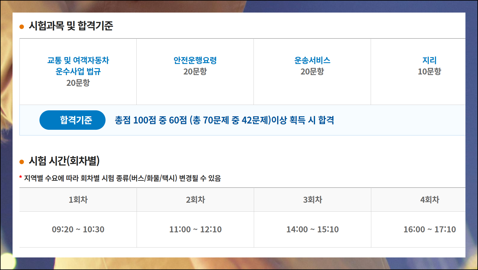 운전자격 취득 준비를 시작할 때는 시험 과목과 합격 기준을 정확히 파악하세요. 특히 합격 조건을 제대로 아는 것이 중요한데요, 많은 택시운전 지망생들이 한 두개의 문항 차이로 불합격하는 안타까운 상황이 발생합니다. 자격시험에 안전하게 통과하려면 연습테스트에서 합격선보다 10점 이상 높은 점수를 꾸준히 받을 때 실제 평가에 도전하는 것이 현명해요.