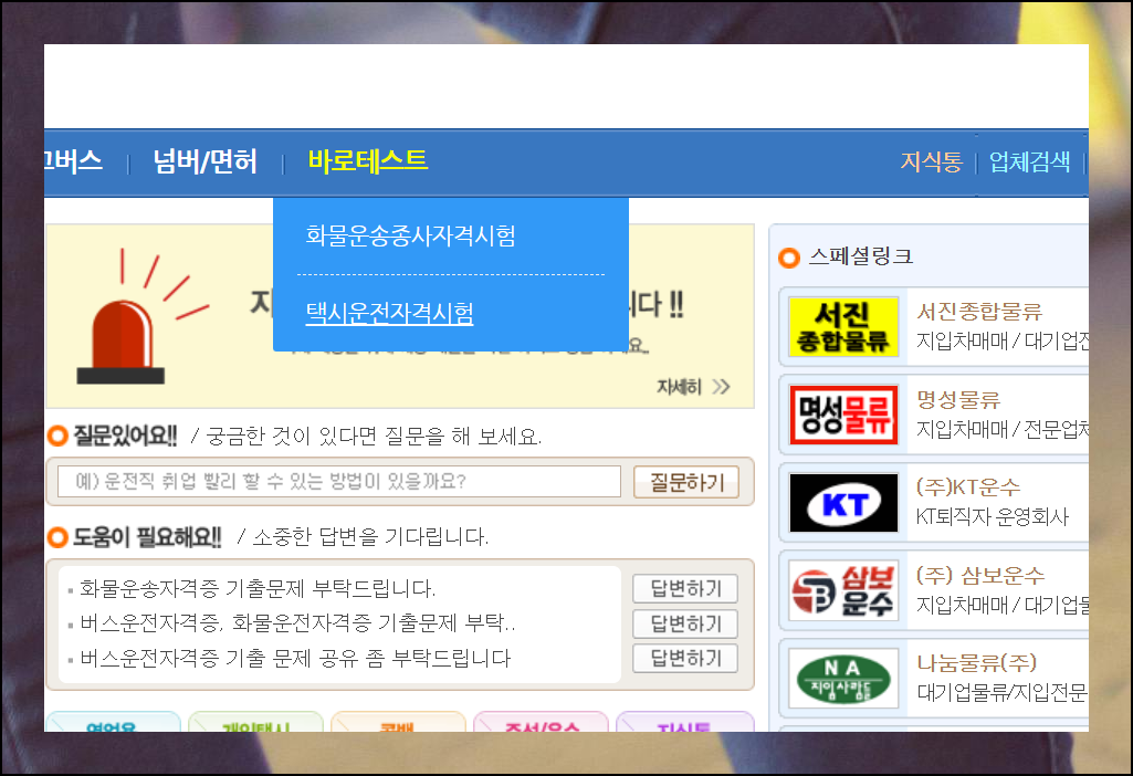 "드라이버스" 사이트에서 누구나 무료로 택시운전 자격시험 자료를 접할 수 있어요. 웹페이지 접속 후 "바로테스트" 메뉴를 클릭하고 하위 카테고리에서 "택시운전"을 선택하면 됩니다. 기출문제를 통해 실전 감각을 익히는 것이 합격의 지름길이니 꼭 활용해보세요.