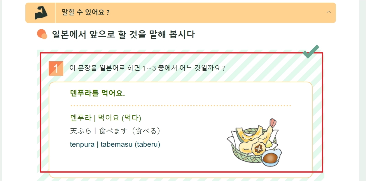 ▼말할 수 있어요 부분은 간단한 퀴즈를 푸는 방식으로 재학습을 할 수 있습니다. 이렇게 하면 오랜 기간 잊지 않을 겁니다.