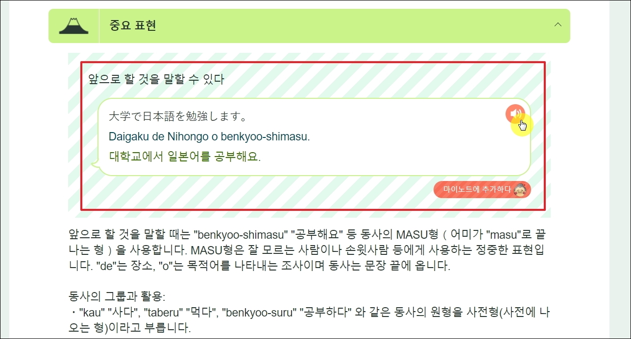 ▼중요 표현에 대한 부분도 자세히 알아볼 수 있습니다. 일본어 배우기 할 때 단순히 암기하기 보다는 이렇게 이해할 수 있는 부분이 필요합니다. 이해를 해야 머릿속에 더 오래 남고, 공부하는 재미도 생겨납니다.