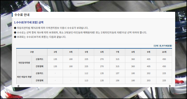 확인 건수에 따라 요금이 달라지니 안내 된 표를 참고해 주세요. 몇 백원으로 수백만 원짜리 자동차의 중요 특성을 파악할 수 있으니 합리적인 지출라고 할 수 있겠죠.