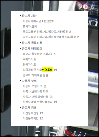 중고차매매 페이지 내에서 "차량 이력조회" 항목을 클릭하세요. 이 화면은 중고 자동차 거래에 필요한 다양한 가이드와 조회 기능을 모아 놓았습니다.