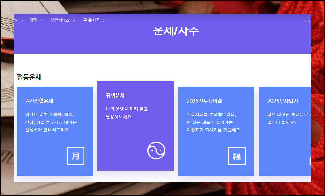 운세 페이지에 들어가면 월간 종합운, 평생운, 신토정비결 등 다양한 역술 프로그램을 선택할 수 있어요.