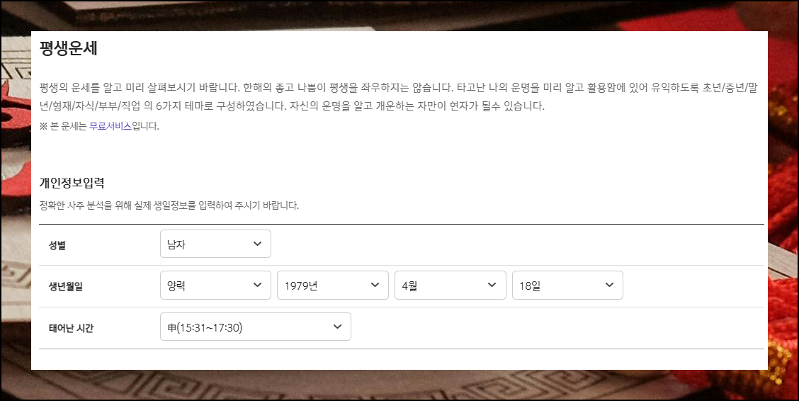 평생운을 선택하면 무료로 사주를 볼 수 있다는 안내가 나타나요. 사이트의 해석을 제대로 받아보기 위해 성별, 생년월일, 태어난 시각을 제대로 입력한 후, [운세 보기] 버튼을 클릭하세요.
