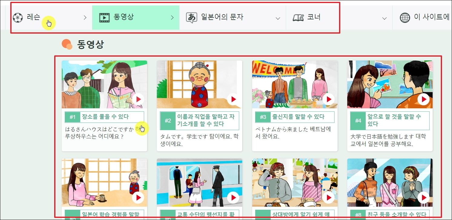 ▼글자와 기초 문법 배우기 완료한 이후에는 일본어 회화 레슨을 받으면 됩니다. 장소 묻기, 자기소개 하기, 출신지 말하기 등 여러 상황에 맞는 회화 과정을 배울 수 있습니다.