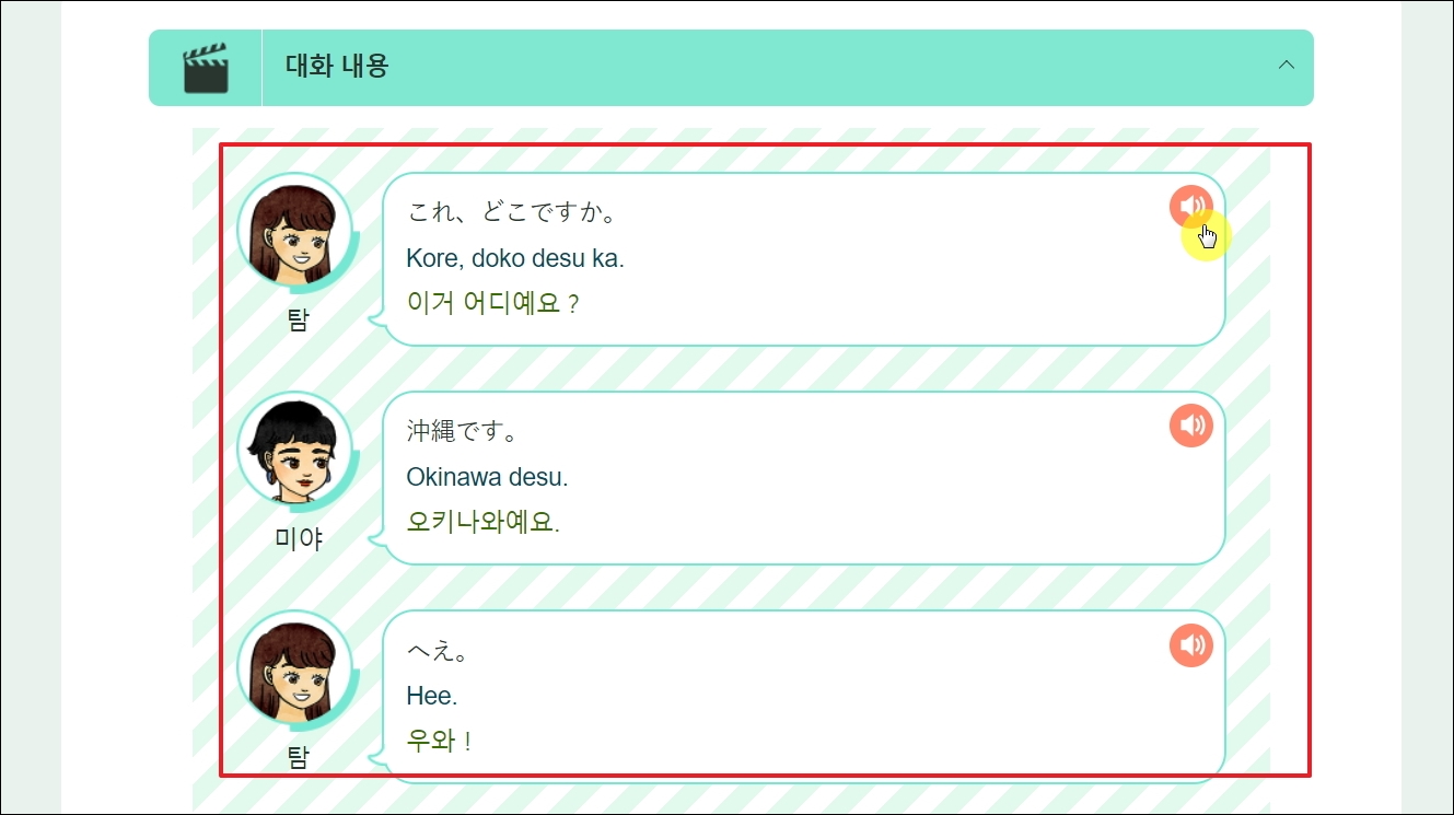▼영상 다음에는 대화 내용을 한글, 일본어, 영어로 볼 수 있는 부분이 나타납니다. 옆에 있는 스피커 모양을 클릭하면 문장을 읽는 것을 들어볼 수도 있습니다.