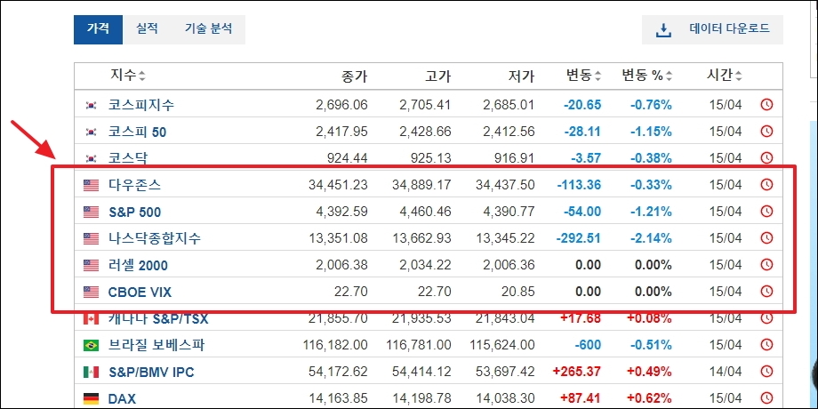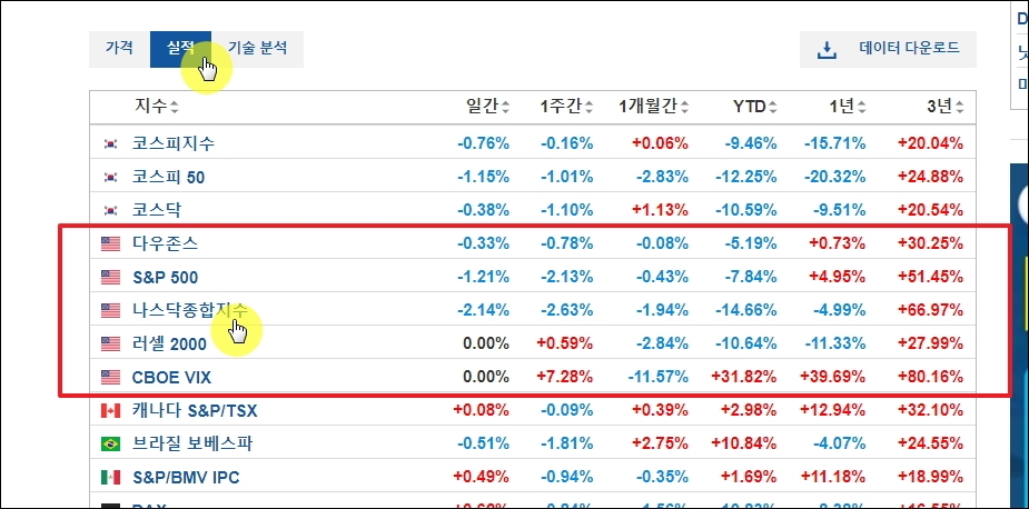 ▼세계 주요 지수 페이지가 열렸습니다. 여기서 본격적으로 미국증시 실시간 보는 방법을 알려드릴테니 따라해 보시길 바랍니다. 이곳에서는 실적이나 기술 분석 위주의 표를 보는 것도 가능합니다. 실적을 기준으로 보았을때 최근 3년동안 미국증시가 많이 상승했음을 알 수 있습니다. 올해 2022년부터는 하락 국면에 접어드는 모습이 보이는 것 같습니다. 좀 더 자세하게 미국증시를 알아보고 싶다면 지수명을 클릭해 봅니다.