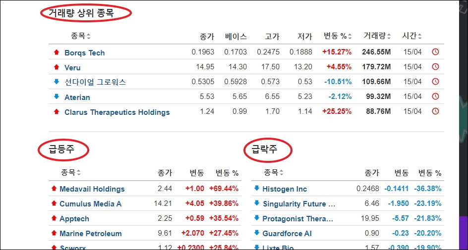 ▼나스닥 미국증시를 구성하는 종목에 대한 정보도 확인할 수 있습니다. 거래량이 많거나 상승 또는 하락폭이 큰 종목 위주로 나타나는데, 여기 있는 종목의 시세 또한 실시간으로 움직이기 때문에 빠르게 보는 것이 가능합니다.