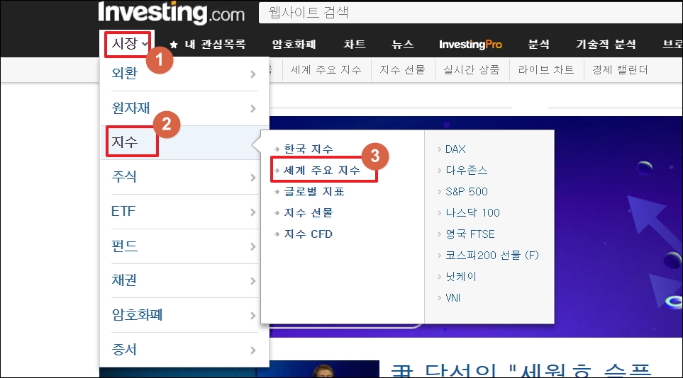 ▼인베스팅 공식 홈페이지에 접속했습니다. 메뉴에서 [시장]을 선택합니다. 그럼 세계 주요 지수를 볼 수 있는 메뉴를 찾을 수 있습니다. 참고로 [지수 선물]을 클릭하면 미국증시를 포함한 전 세계 주요 나라의 선물지수를 실시간으로 보는 것이 가능합니다.