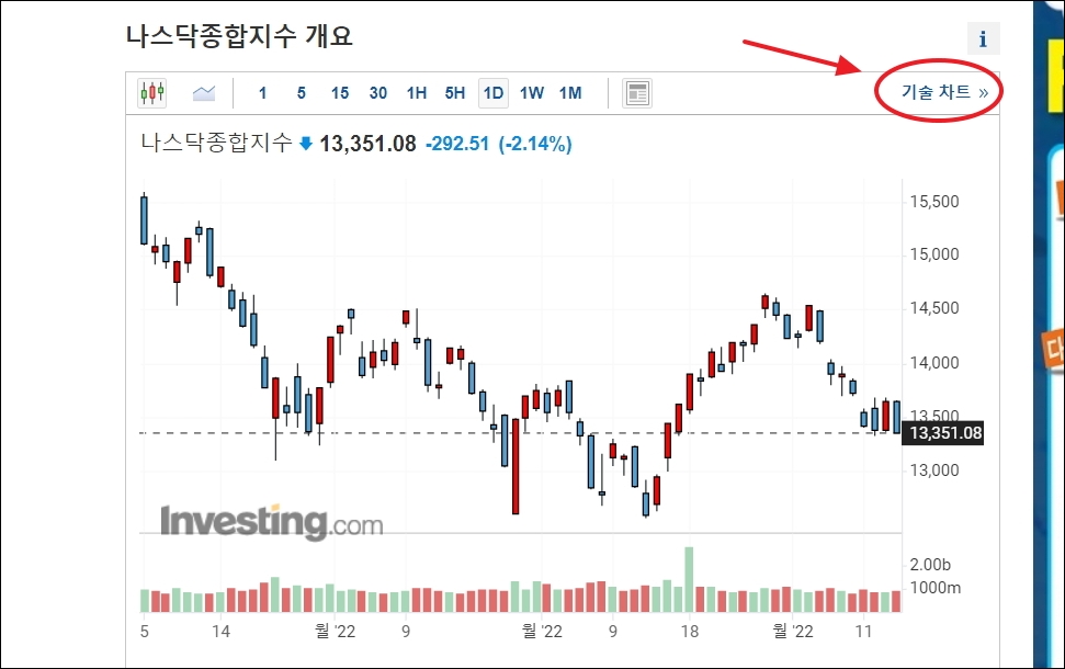 ▼차트에서 [기술 차트] 버튼을 클릭하면 다양한 보조 지표와 분석 도구를 사용할 수 있습니다. 기술 차트 또한 미국증시 흐름을 실시간 보는 용도로 사용할 수 있습니다. 보조지표 보는 방법은 간단합니다. 차트 화면에 마우스 우클릭을 하면 지표를 추가하는 메뉴가 나는데, 해당 메뉴를 선택한 후 사용하고 싶은 보조지표를 선택하면 됩니다.