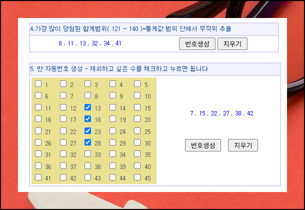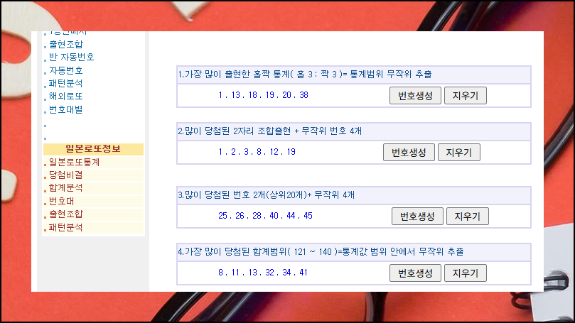 이런 다양한 분석 데이터를 활용해 로또 구매 시 사용할 번호를 반자동 생성기를 통해 추천 받을 수 있어요. 홀짝 통계, 자주 나온 조합, 적정 합계 범위 등 여러 요소를 고려한 맞춤형 숫자를 제안 받을 수 있습니다.